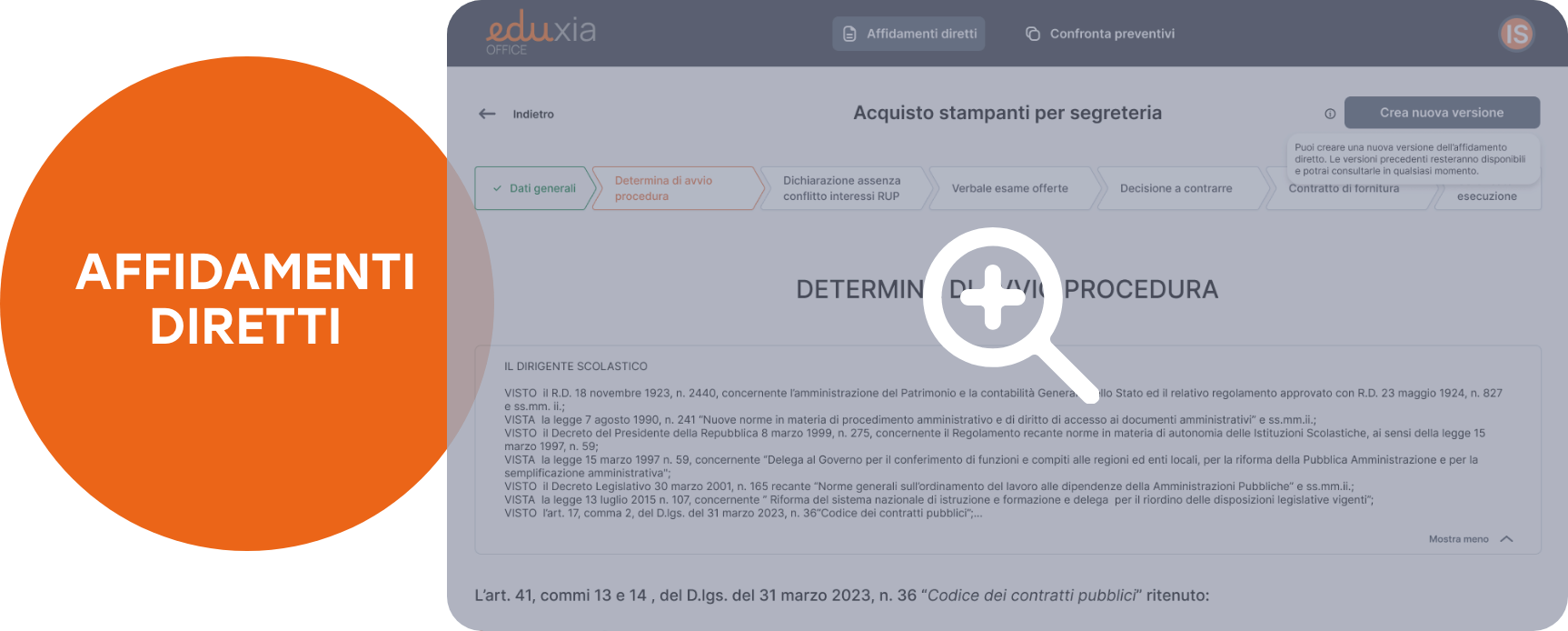 Con un percorso guidato, EDUXIA Office supporta le segreterie scolastiche nel creare rapidamente tutta la documentazione necessaria per affidamenti e procedure amministrative, alleggerendo il carico di lavoro, garantendo correttezza formale e riducendo i tempi di lavorazione.