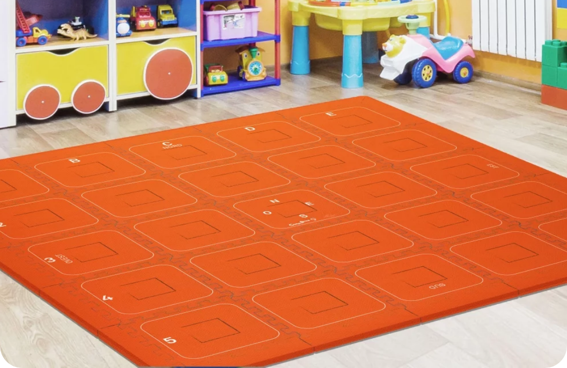 Le tessere centrali hanno un foro quadrato che consente di inserire diversi tipi di tasselli, rendendo il tappeto versatile e adattabile a varie attività. È compatibile con robot didattici, permettendo un’integrazione tra attività unplugged e robotica educativa.